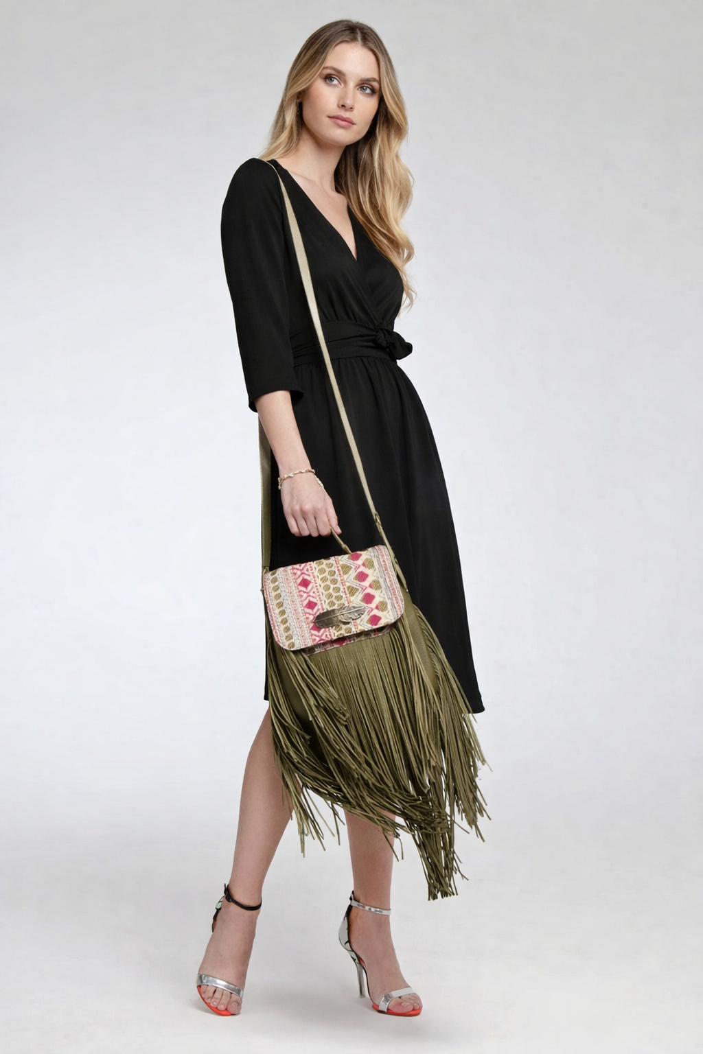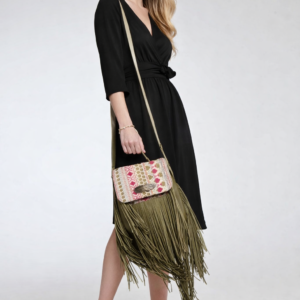 Instant boho vibes with this handcrafted leather bag. Features hand-cutted fringes and a non removable shoulder strap. The metallic feather decoration states your free spirit attitude.