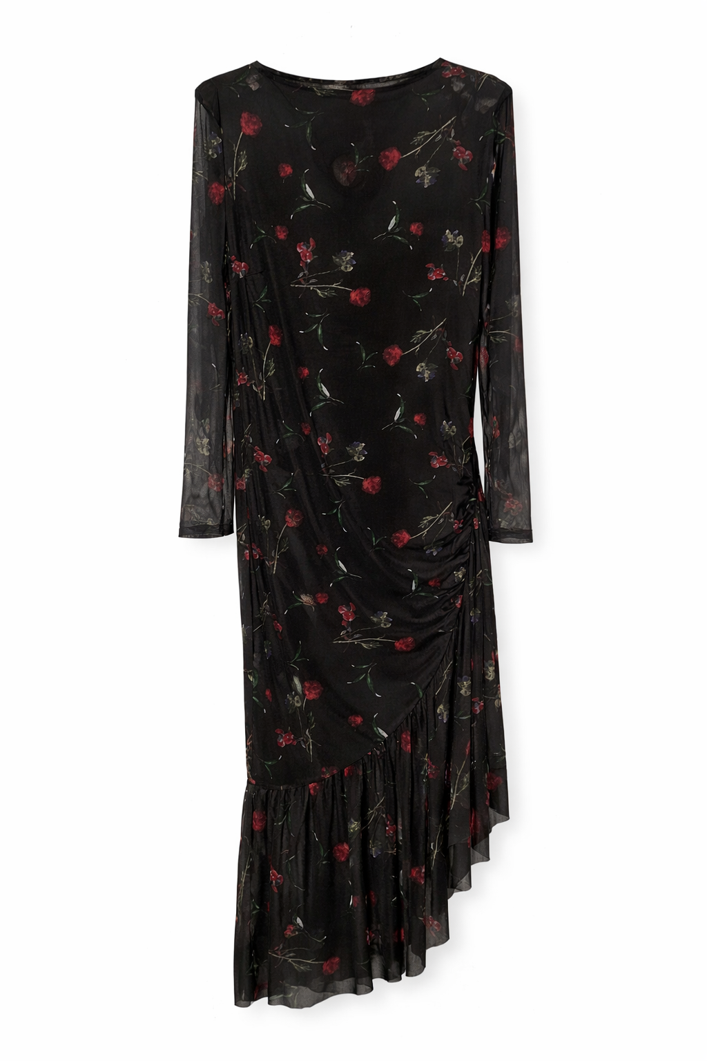 An elegant black midi dress featuring a delicate floral print that adds a romantic and feminine touch. Crafted from lightweight, semi-sheer fabric, this dress offers graceful movement and a soft, airy feel. The long sleeves and relaxed silhouette create a timeless look, while the subtle pleated detailing enhances its flow and elegance.