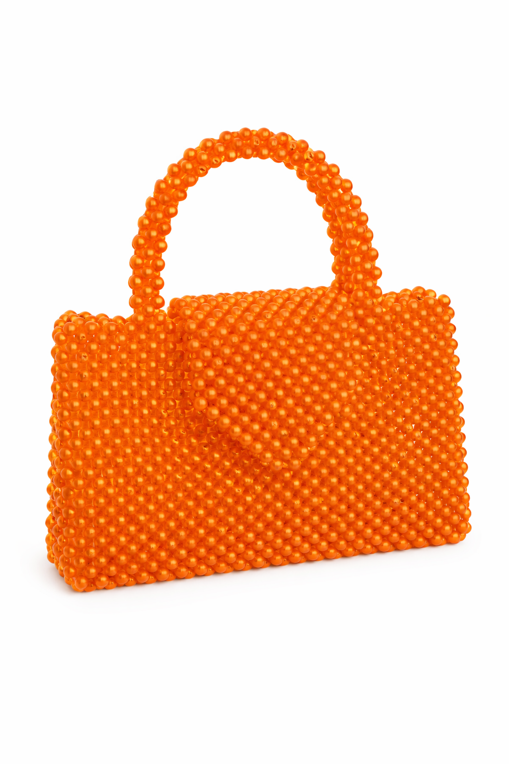 This eye-catching handbag is crafted from glossy orange beads, creating a unique textured design that adds a bold statement to any outfit. The structured silhouette and sturdy top handle offer both style and practicality, making it perfect for day or evening occasions.