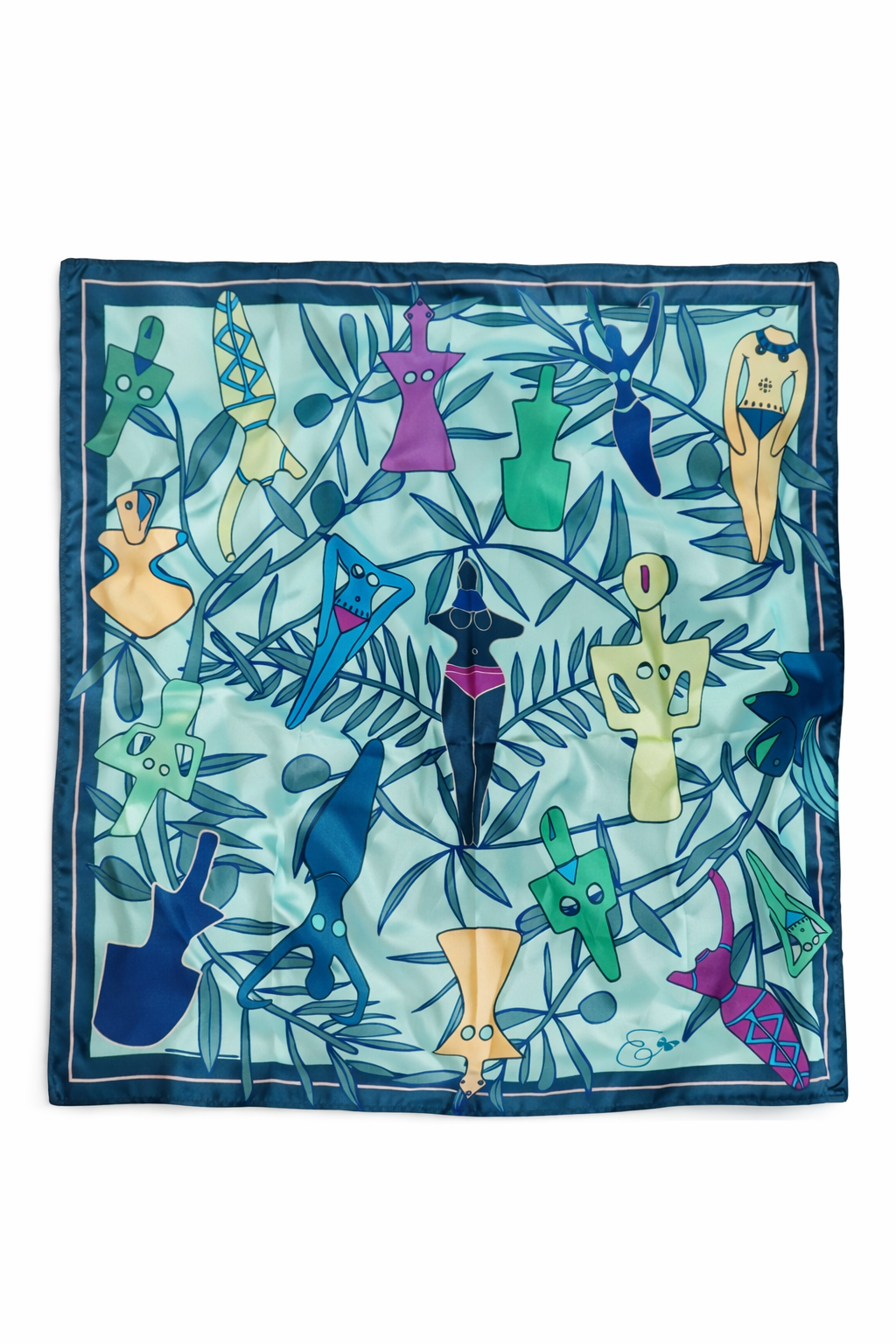A vibrant silk scarf featuring an artistic illustrated design with bold colors and playful details. Lightweight and smooth to the touch, it drapes beautifully and adds a statement finish to any outfit. Perfect to wear around the neck, in the hair, or styled on a bag for a pop of color.